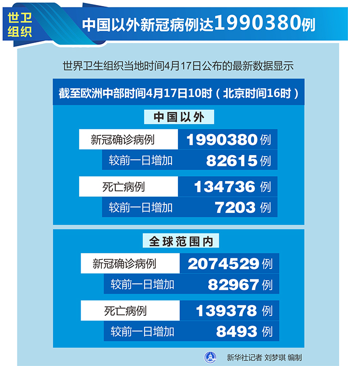 世衛組織每日(ri)疫(yi)情(qing)報告(gao)顯示,截至歐洲(zhou)中部時間(jian)17日(ri)10時(北京時間(jian)16時),中國以外(wai)新冠確診病例(li)較前一(yi)日(ri)增加82615例(li),達到1990380例(li);中國以外(wai)死亡病例(li)較前一(yi)日(ri)增加7203例(li),達到134736例(li)。