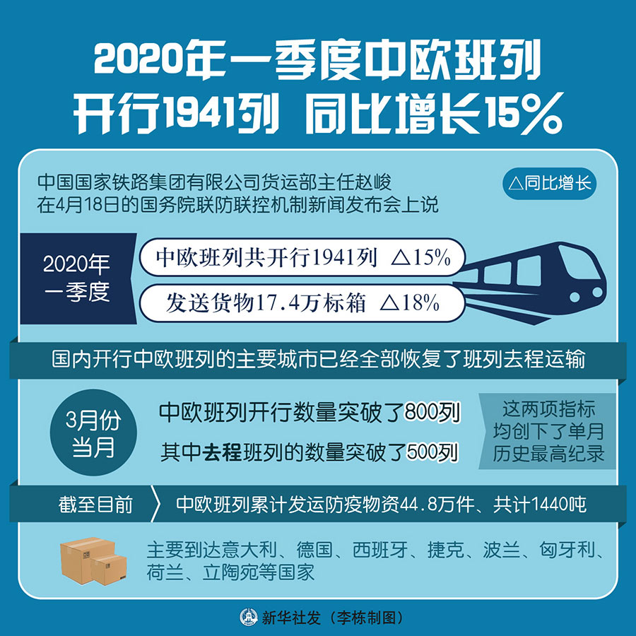 新(xin)華社北京4月18日電(記者(zhe)王希、于文靜(jing))中國國家(jia)鐵路集團有限公(gong)司(si)貨運部主任(ren)趙峻在18日的國務院聯防聯控機制新(xin)聞發布會上(shang)說,今(jin)年一季度,中歐班列共開(kai)行1941列,發送貨物17.4萬(wan)標箱(xiang),同比分別增長15%和18%。