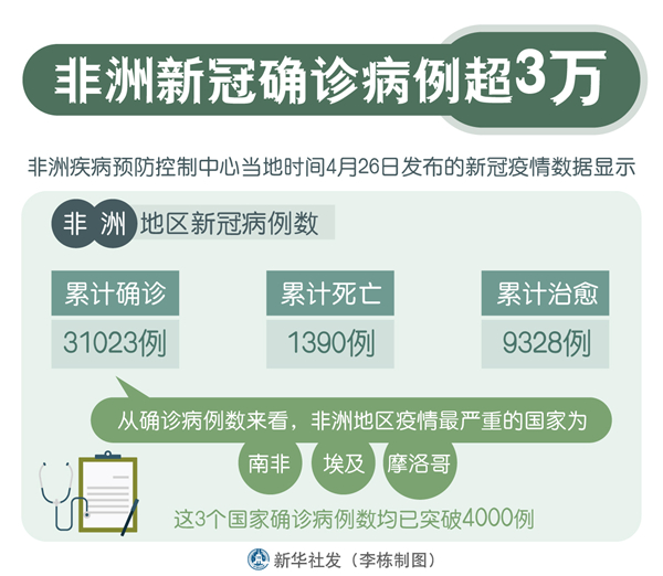 新華社達累斯薩拉姆4月26日電 綜合新華社駐非洲地區記者報道:非洲疾病預防控制中心26日發布的新冠疫情數據顯示,非洲地區新冠累計確診病例數為31023例,累計死亡1390例,累計治愈9328例。為支持非洲各國抗擊新冠疫情,聯合國推出信息平臺協助抗疫。