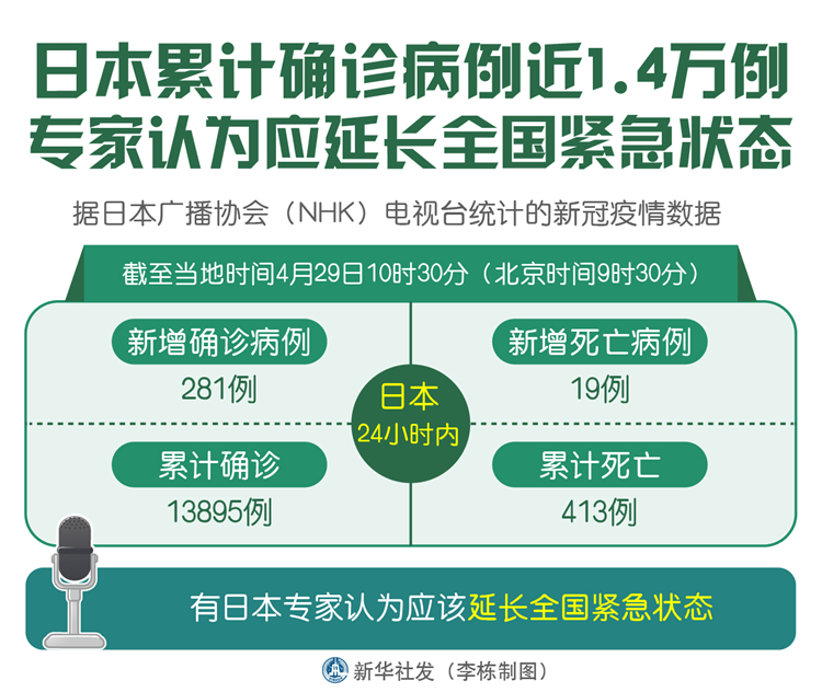 新華社東京4月29日電(記者華義)據日本廣播協會(NHK)電視臺統計的新冠疫情數據,截至29日10時30分(北京時間9時30分),日本24小時內新增確診病例281例,累計確診13895例;新增死亡病例19例,累計死亡413例。有日本專家認為應該延長全國緊急狀態。