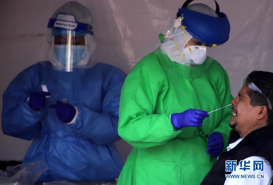 11月14日,在墨西哥首都墨西哥城,醫務人員為一名男子采集檢測樣本。
