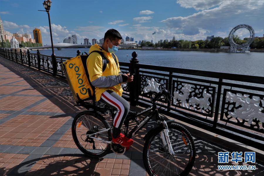 8月18日,在哈薩克斯坦首都努爾蘇丹,外賣小哥薩別爾別科夫騎車送餐。新華社發(奧斯潘諾夫攝)