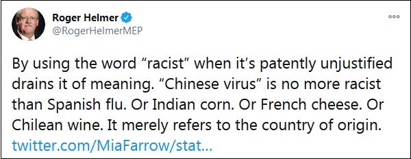 大量網友在他的這條推特下,挖出赫爾默曾經發表的言論。例如早在3月17日,赫爾默就在一條推特中宣稱:“在明顯不合理的情況下,使用‘種族主義’這個詞會讓它失去意義。‘中國病毒’和‘西班牙流感’一樣不是種族主義。就像印度玉米,或法國奶酪,或者智利葡萄酒。它僅僅是指原產國。”