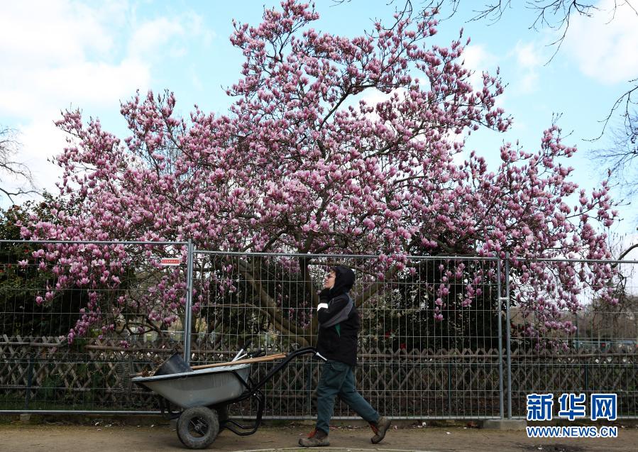 3月19日,在法國巴黎埃菲爾鐵塔腳下的戰神廣場,一名園丁路過玉蘭花。新華社記者高靜攝
