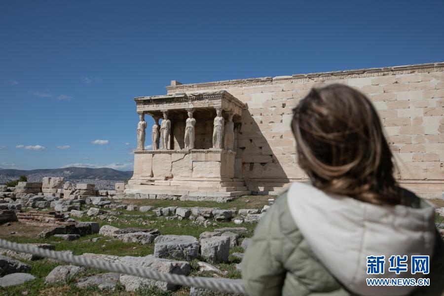 3月22日,一名游客游覽希臘雅典衛城。希臘露天考古遺跡22日起恢復開放。游客需遵守保持社交距離和佩戴口罩等防疫規定。新華社發(萊夫特里斯·帕察里斯攝)
