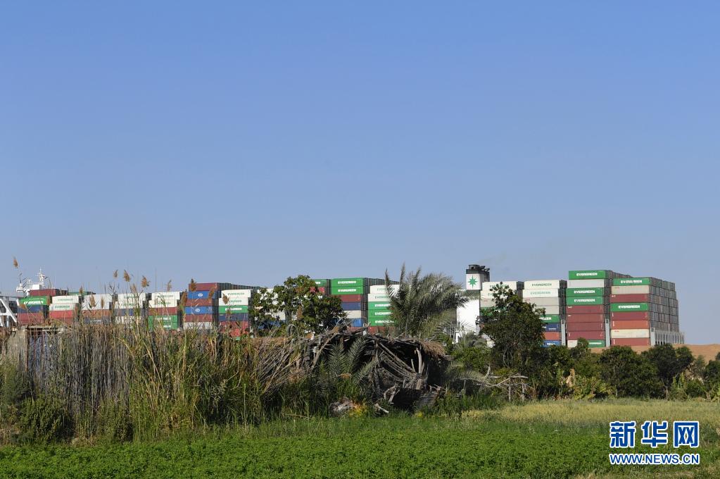 這是3月29日拍攝的移動至埃及蘇伊士運河正常航道上的重型貨輪。