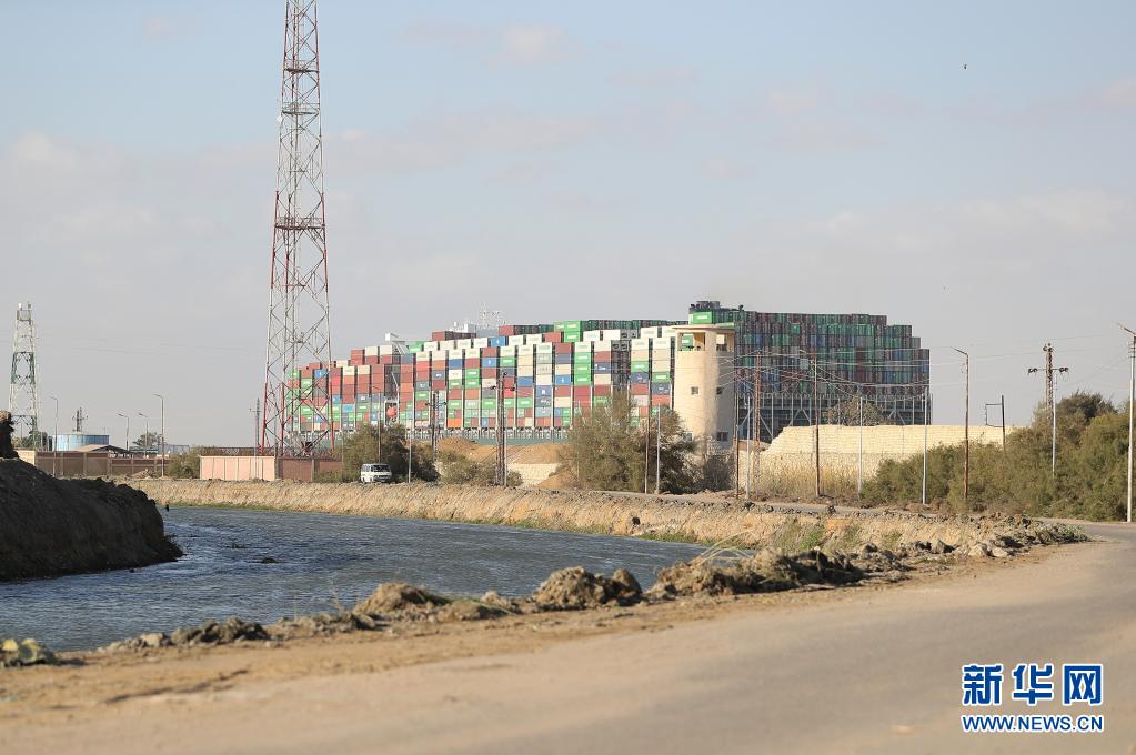 這是3月29日拍攝的移動至埃及蘇伊士運河正常航道上的重型貨輪。
