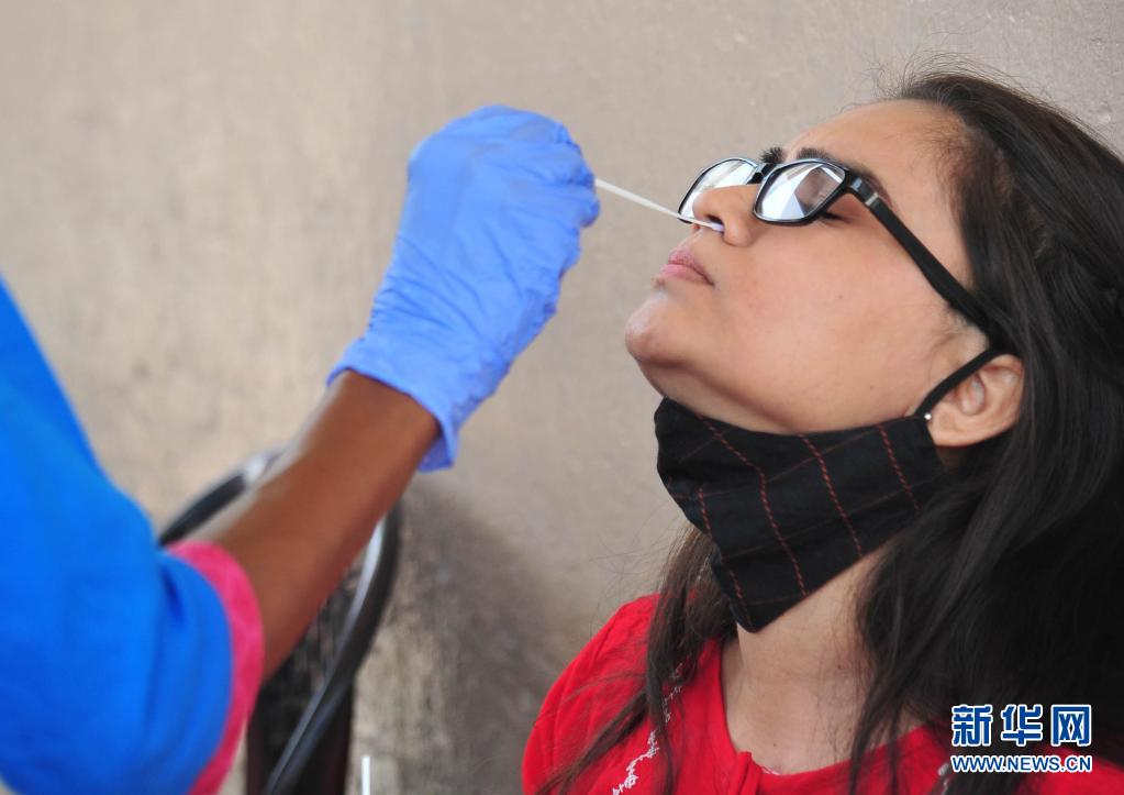 4月11日(ri),一(yi)名(ming)女子在印度班加羅爾的一(yi)個公交(jiao)站接受(shou)新冠病毒檢測(ce)取樣。