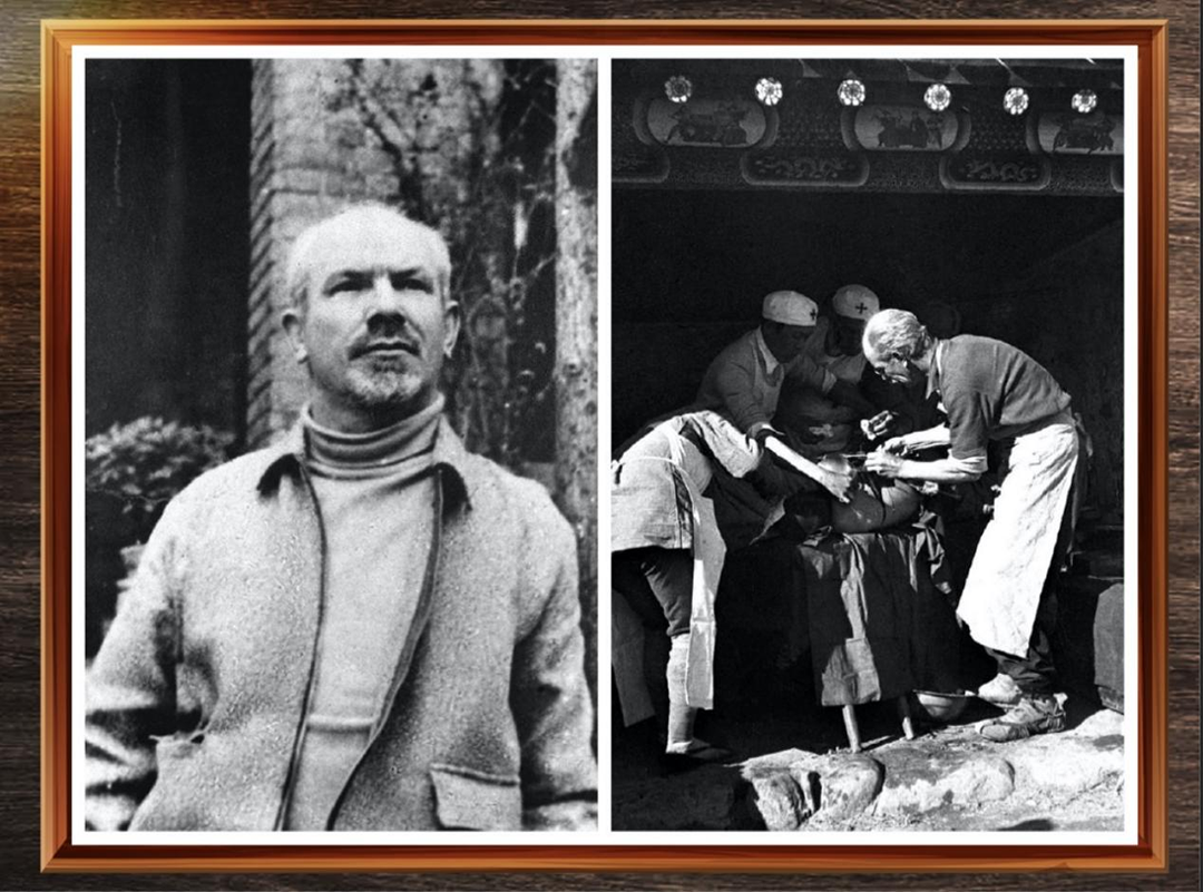 左圖是白求恩;右圖是白求恩在晉察冀邊區淶源縣臨時手術室里為傷員做手術。