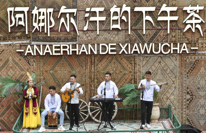院中舞臺上,五位伊寧青年組成的樂隊,用吉他、電子琴、熱瓦普、手鼓等合奏,氣氛熱烈歡快。當主唱開始演唱《我的中國心》,全場歡呼聲達到最高潮,南腔北調匯聚一堂,齊唱這首耳熟能詳的時代之音。