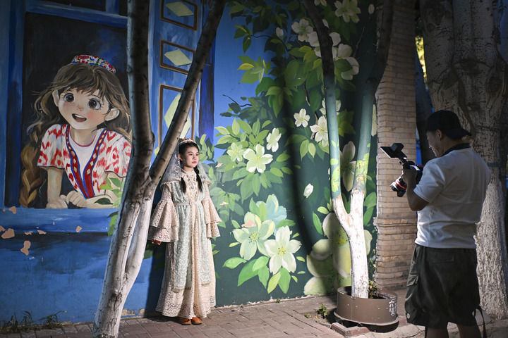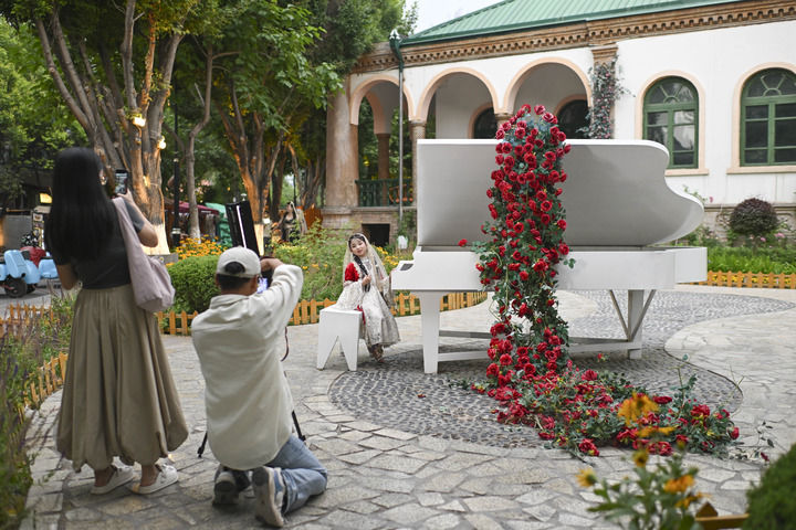 攝影師在伊寧市六星街為小游客拍攝照片(6月4日攝)。本組圖片均由胡虎虎攝