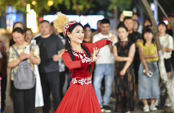 剛過去的暑期,祖力喀爾·買買提第一次在六星街兼職“商演”。他和好友組成舞蹈隊,在幾家特色餐廳前跳舞,為商戶招攬客人。這些帥氣靚麗的青春舞者身著傳統服裝,踩著節拍,用舞姿和表情,精準地呈現伴奏的情緒和內容,引來大量的觀眾。
