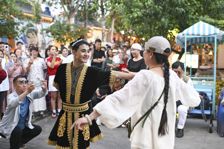祖力喀爾·買買提(左)和游客在伊寧市六星街跳舞(5月31日攝)。