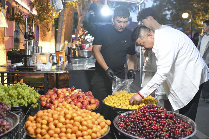 游客在伊寧市六星街選購杏子等水果(6月4日攝)。