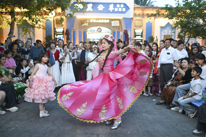 舞蹈演員在六星街跳舞,吸引大量游客圍觀,小朋友興奮地加入其中(2025年5月31日攝)。