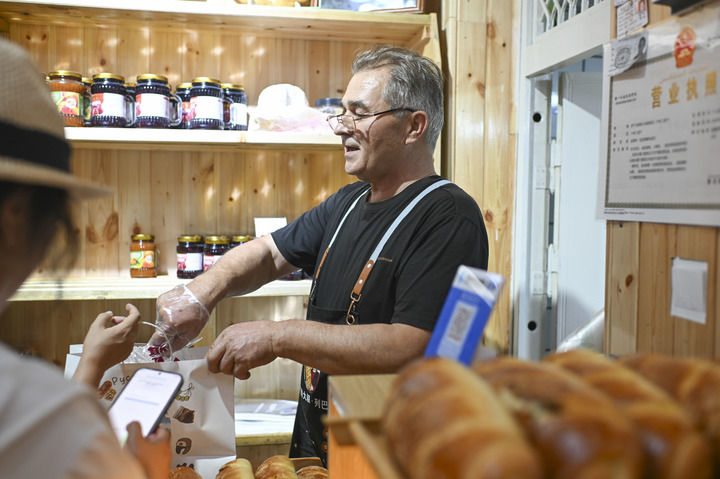 一家列巴店老板皮特羅·克拉斯娜烏索夫在店內和顧客交流(6月6日攝)。