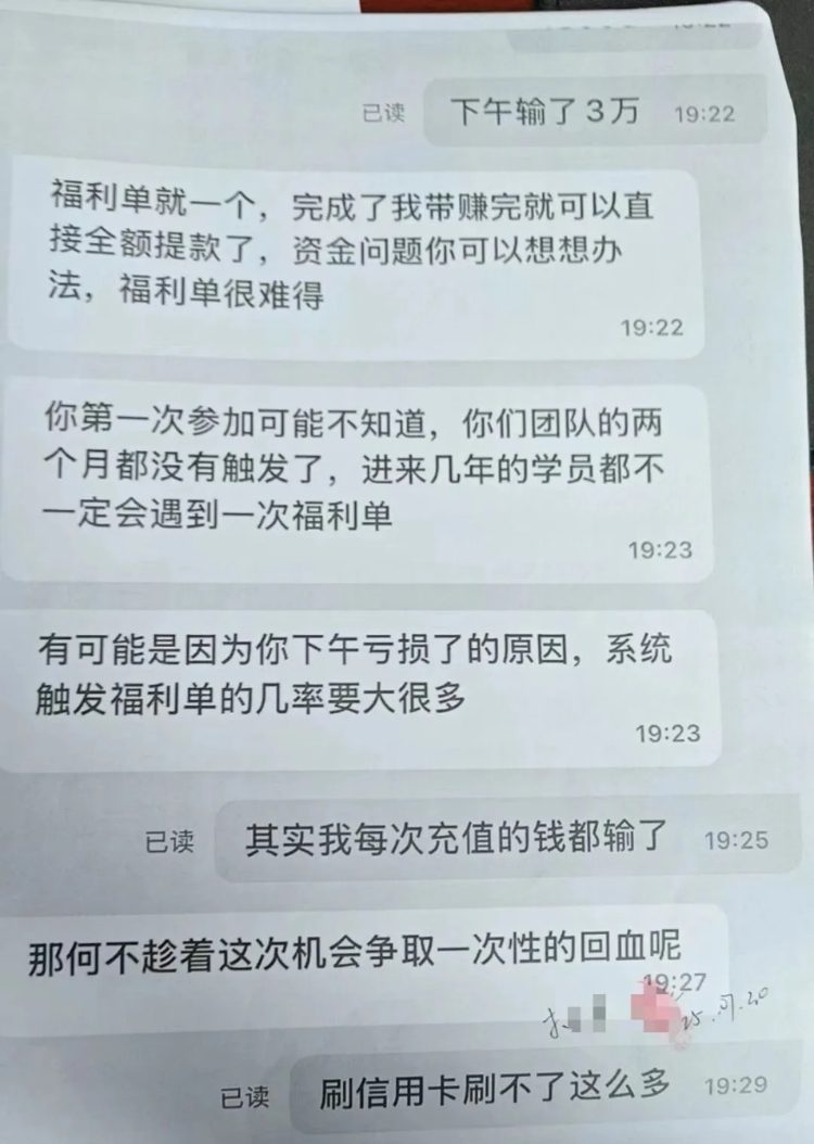 第三步:用“小額甜頭+福利單”,逼你加碼。為進一步誘騙你投入更多,騙子會先讓你嘗到小甜頭,比如徐女士起初收到的小額入賬。等你開始依賴“導師”,再用“虧損后觸發福利單”等說辭,讓你投入更多,套得更深。