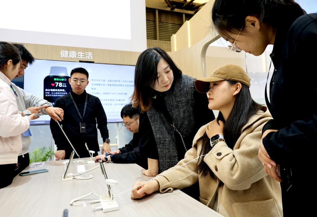 一位參觀者(右二)在2025中國家電及消費電子博覽會(AWE2025)體驗智能手表的腕部動態血壓記錄儀功能。新華社記者方喆 攝