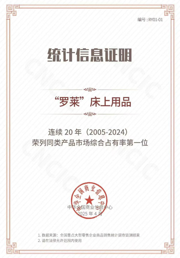以精工品質為根基,融合智能科技革新,羅萊生活贏得了眾多消費者的信賴。2005 年至今,羅萊床上用品連續20年榮列同類產品市場綜合占有率第一。未來也將繼續通過智能化產品創新,為消費者構建更完善的健康睡眠解決方案。