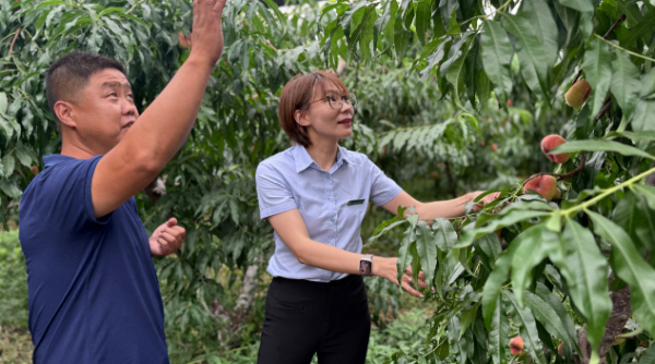 郵儲銀行張家港市塘橋鎮支行行長楊丹深入鳳凰鎮桃園,了解桃農收成幾何,進一步探索農戶資金需求。新華網梁棟飛 攝