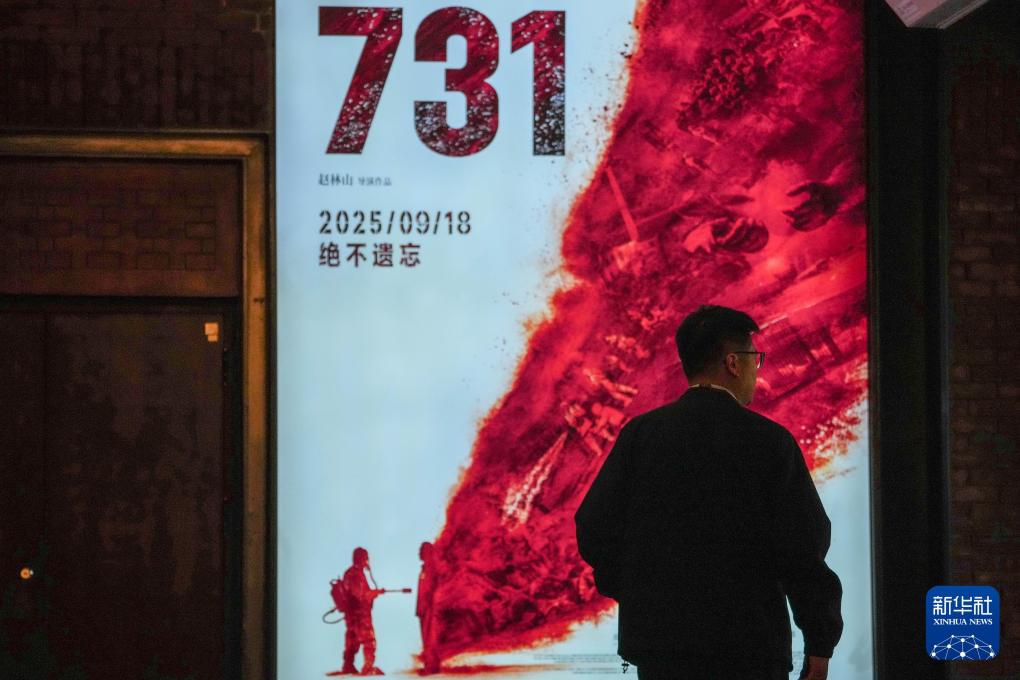 9月18日,在位于吉林長春的長影電影院,觀眾從電影《731》海報前走過。
