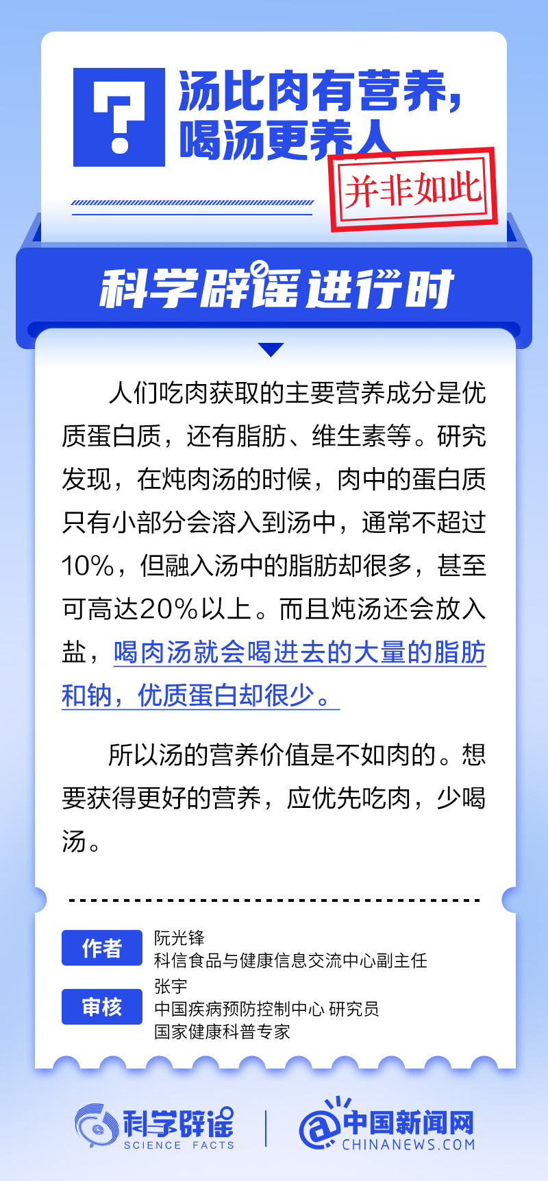 人們吃肉獲取的主要營養成分是優質蛋白質,還有脂肪、維生素等。研究發現,在燉肉湯的時候,肉中的蛋白質只有小部分會溶入到湯中,通常不超過10%,但融入湯中的脂肪卻很多,甚至可高達20%以上。