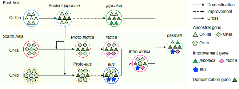 基于高質量的基因組序列,對亞洲栽培稻各類群中的早期關鍵馴化基因進行單倍型分析,證明所有亞洲栽培稻的馴化位點均來源于粳稻祖先Or-IIIa,進一步證實了亞洲栽培稻單起源假說,為持續數十年的學術爭議提供了關鍵證據。此外,研究還發現在南亞各栽培稻類群之間存在廣泛的基因交流,并由此定義了一個新的栽培稻亞群intro-indica,成功繪制了一幅全面的水稻進化和馴化路線圖。